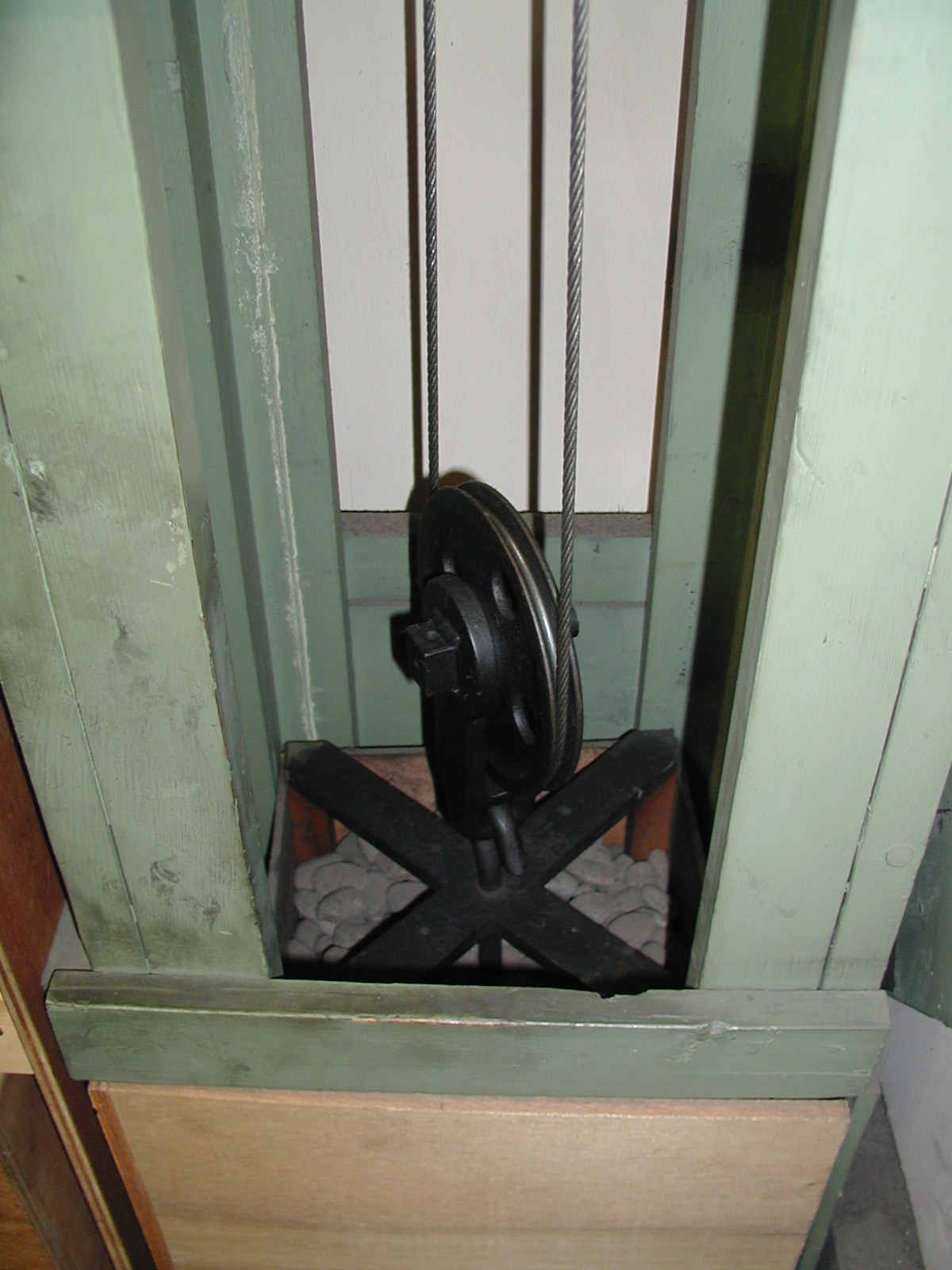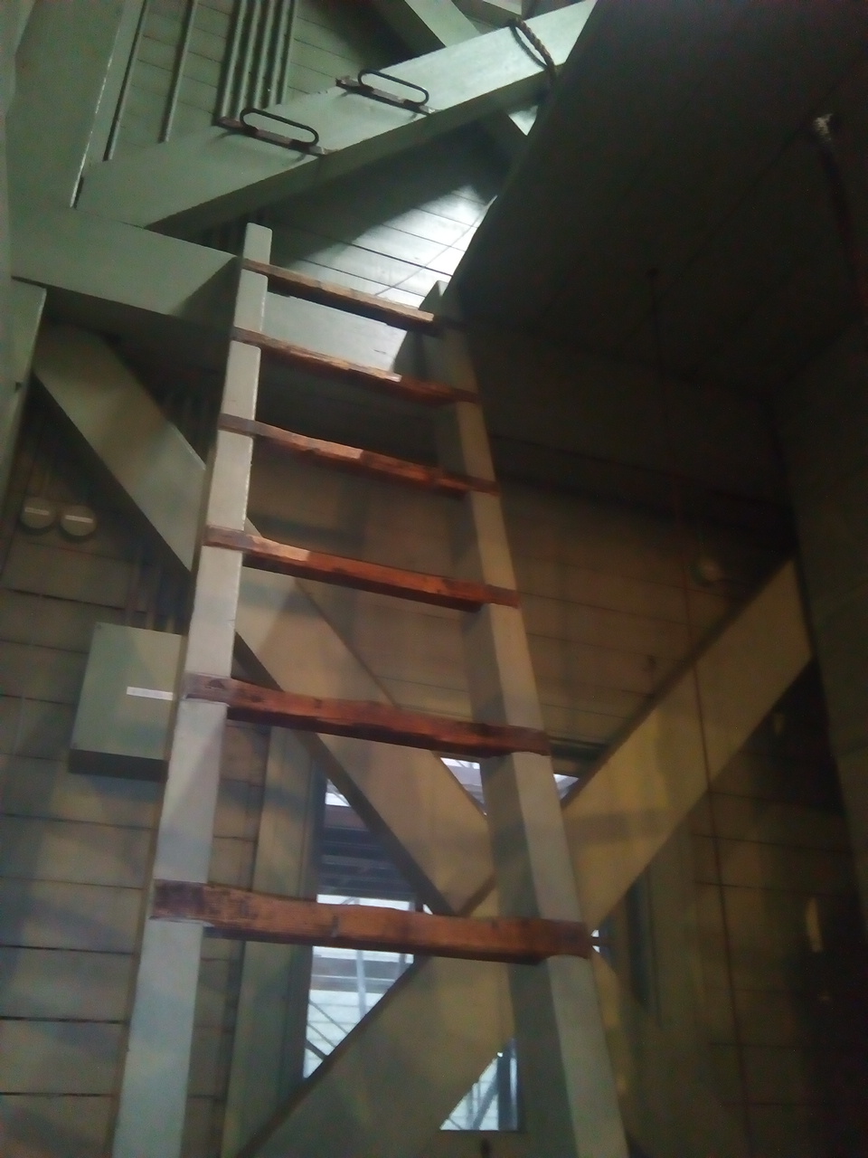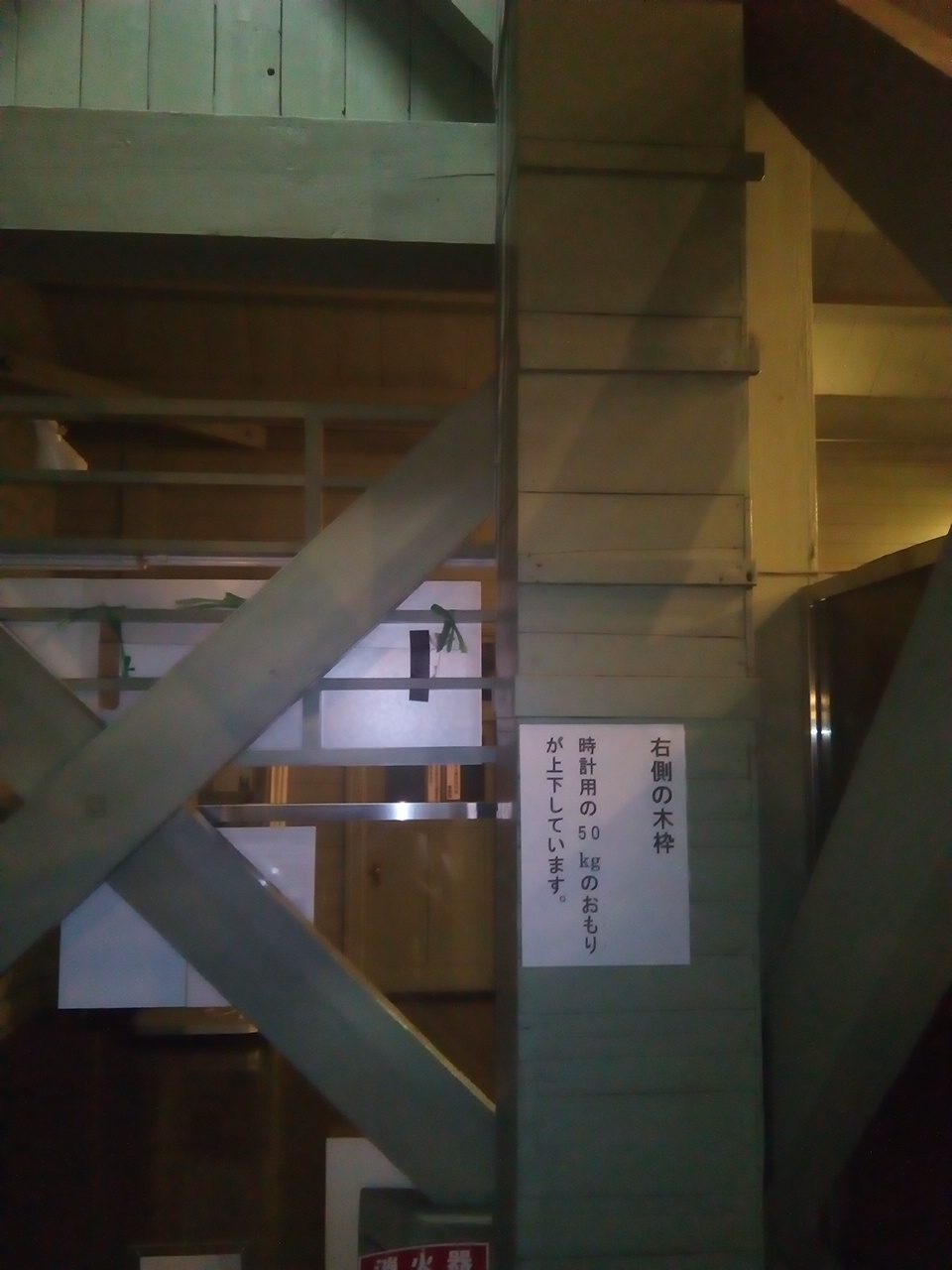 時計用のおもり 重量50kg 寸法340×340×620㎜の木箱に小石を詰めています 降下量 70cm/日(2.9cm/時) おもりの稼動範囲 時計機械室~2階 時計用おもり枠 時計用のおもり枠です。機械室~2階まで繋がっています。 3階までのはしご 3階までのはしごです。 1881(明治14年)に設置されてから使い続けています!