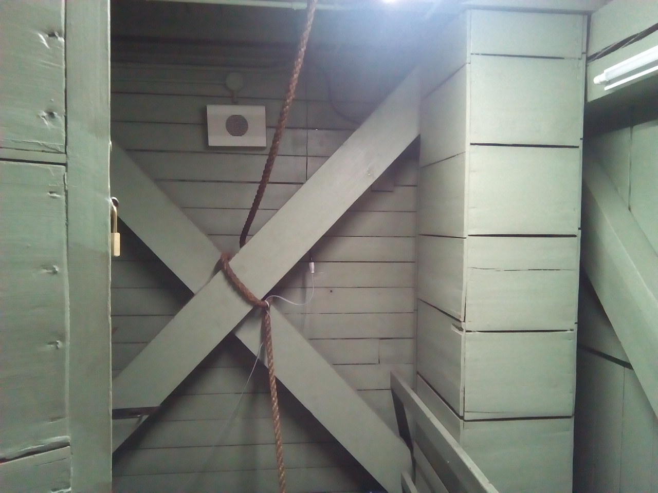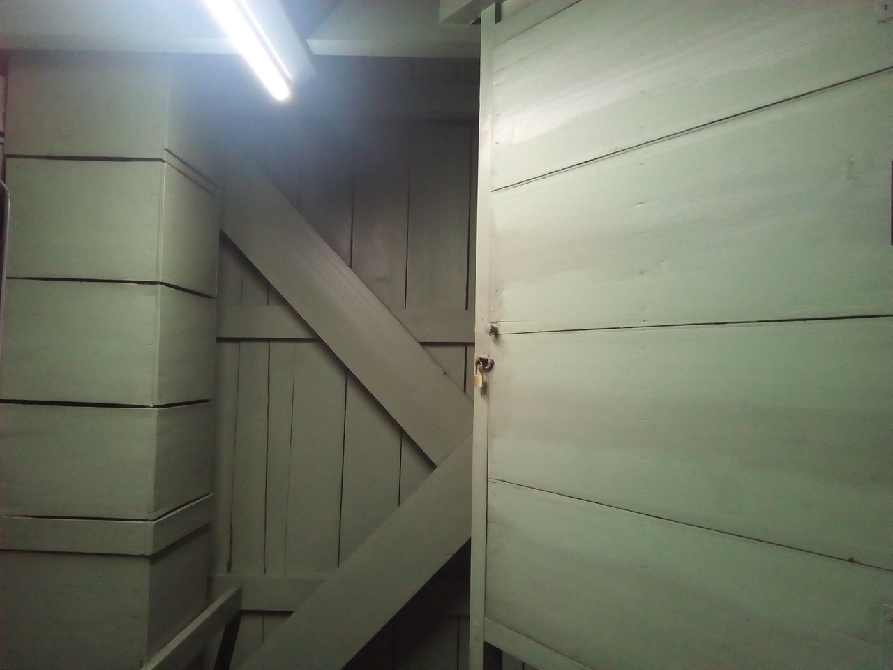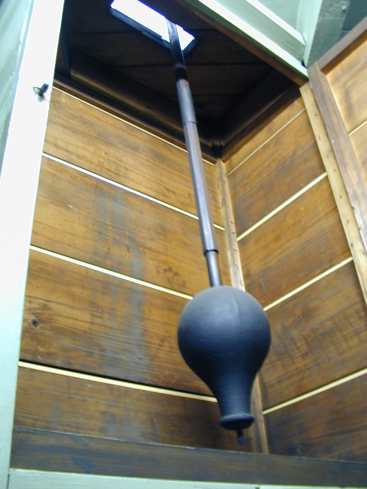 振子 振竿の材質 マホガニー、振玉は鉄製、振子の周期3.15秒 振子箱万が一、振りベラが切れ、振子が落下した場合、箱が無いと下まで落ちてしまい重大な事故になります。そのため箱を設けて、振子が落下しないようにしています。 3階振子の箱(外観)と鐘用おもり木枠 左側が振子の箱で、右側が鐘用おもり木枠です。 時計用おもり木枠と振子の箱(外観) 左側が時計用おもり木枠で右側が振子の箱です。