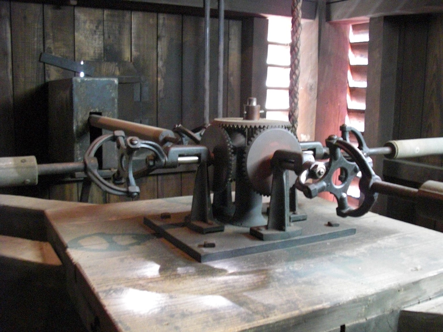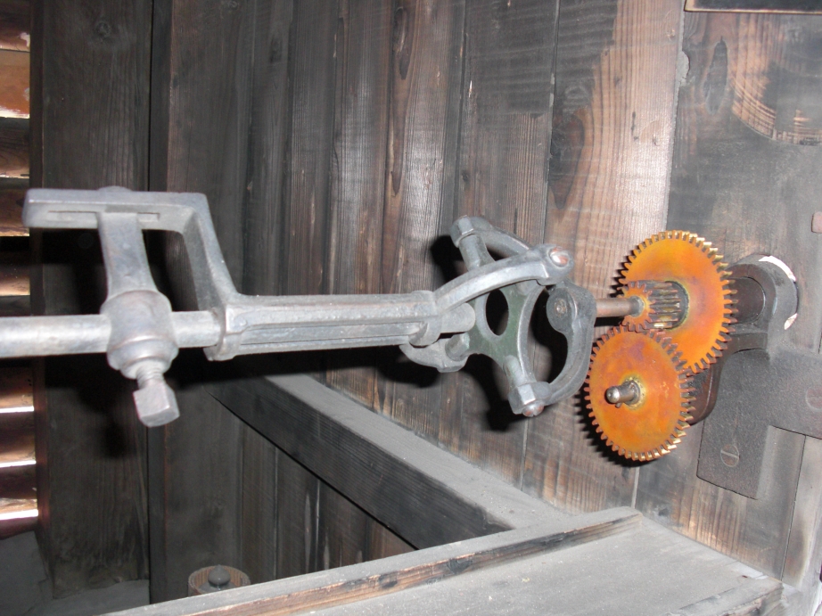 時計機械にて槌を上下させ、槌が鐘を叩くことで鐘が鳴ります。